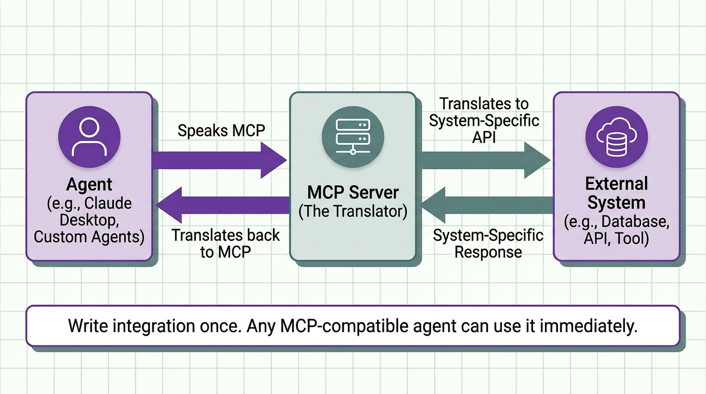 Instead of writing a custom integration for every model and framework, you implement MCP once. Any MCP-compatible agent can then discover and use that tool automatically.