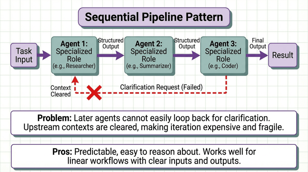 Sequential Pipeline: This pattern moves a task through a fixed chain of specialized agents, where each performs one role and passes structured output to the next. It works well for linear workflows with clear inputs and outputs, making the system predictable and easy to reason about. The problem arises when a later agent needs clarification from an earlier step. Since upstream agents usually clear their context after finishing, there’s no clean way to loop back. Iteration becomes expensive, often requiring the entire pipeline to restart, which makes the system fragile in ambiguous or evolving tasks.