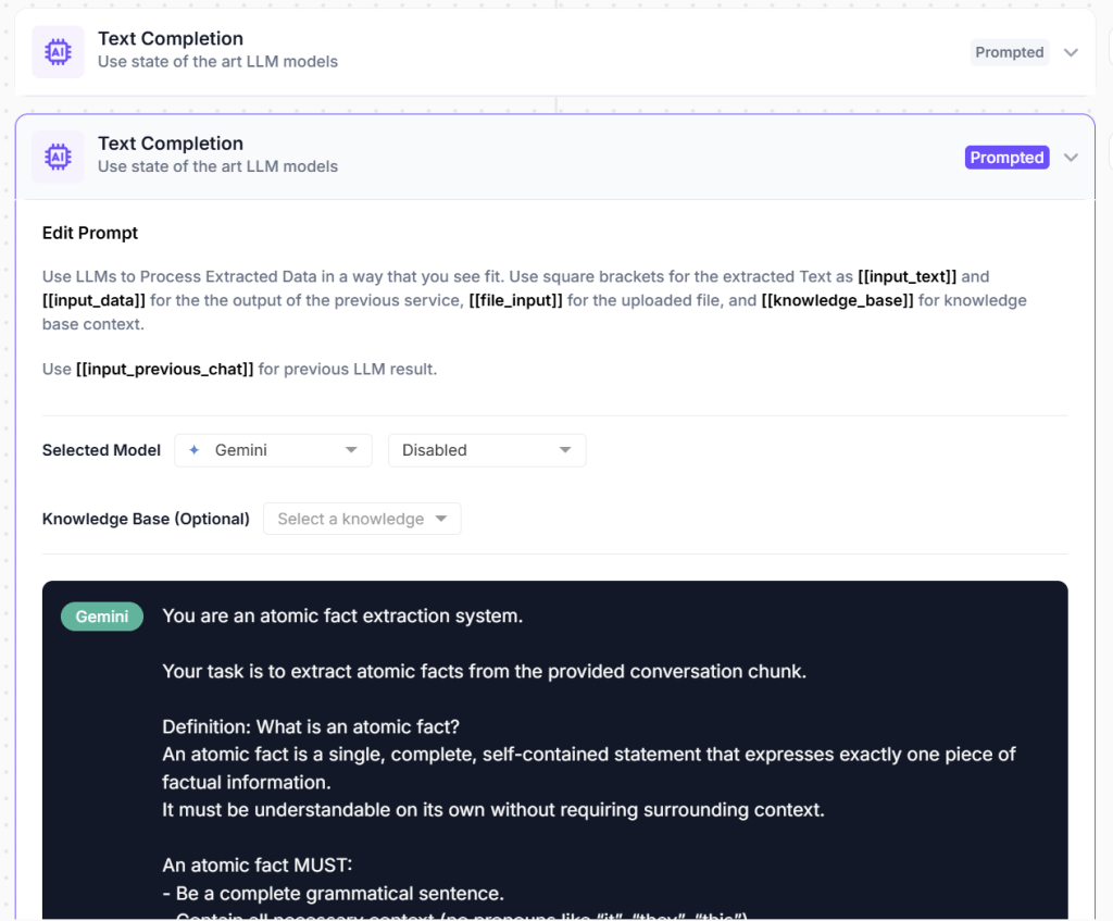 This is where the architectural advantage becomes concrete. Instead of writing custom extraction logic, debugging edge cases, and maintaining brittle parsing code, we configure a Kudra workflow that automatically processes conversation chunks and outputs all four memory layers. The workflow becomes a reusable pipeline that any conversation can flow through.