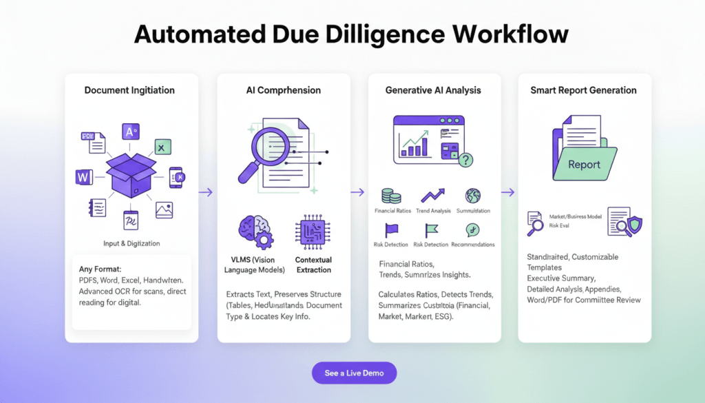 Due diligence automation solves these problems by processing multiple document formats simultaneously, extracting financial data and calculating ratios automatically, generating standardized evaluation reports in hours instead of days, and applying institutional best practices consistently across all evaluations.