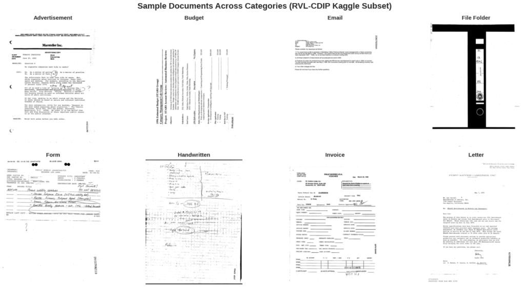 We’ll load the RVL-CDIP dataset, which contains 16 document categories representative of what flows through insurance mailrooms: letters, forms, emails, invoices, reports. While not specifically workers’ comp documents, the visual and structural patterns are directly transferable—and more importantly, this dataset provides the foundation for fine-tuning on insurance-specific documents.