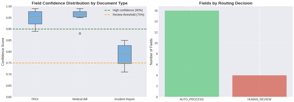 Notice that extraction confidence operates at two levels: document-level (“I’m 94% sure this is an FROI”) and field-level (“I’m 99% sure the date of injury is November 15, 2024”).