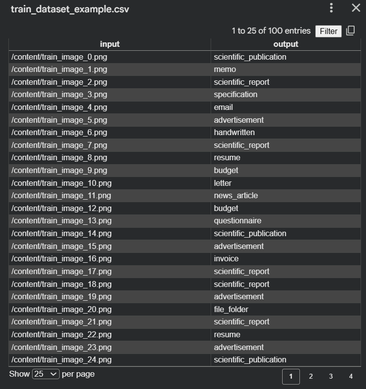 This is just one way of structuring the training data. For now, we will train our Vision-Language Model (VLM) with the data we currently have, which consists of document images and their corresponding classes. Once more labeled information extraction data is available, the same CSV-based approach can be used to extend the model to answer questions, extract fields, or validate document content.