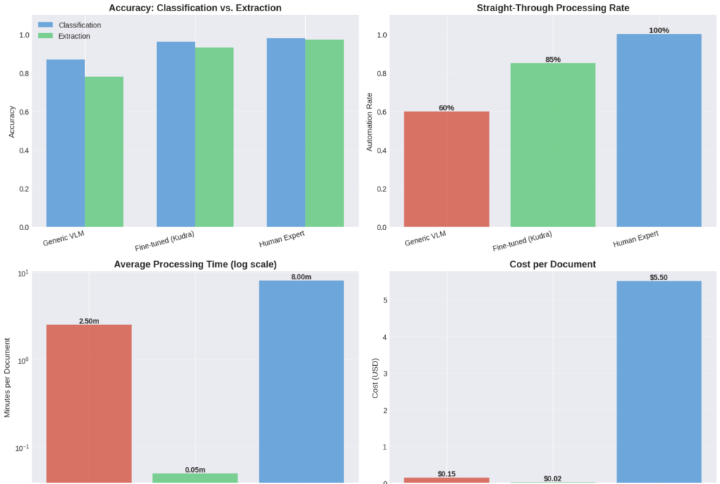 But what if that mismatch could be erased? Vision-language models, when properly fine-tuned for domain-specific document understanding, are transforming the impossible into reality: processing speeds 100 times faster, turnaround times cut from five days to one hour, and straight-through processing rates approaching 90%.