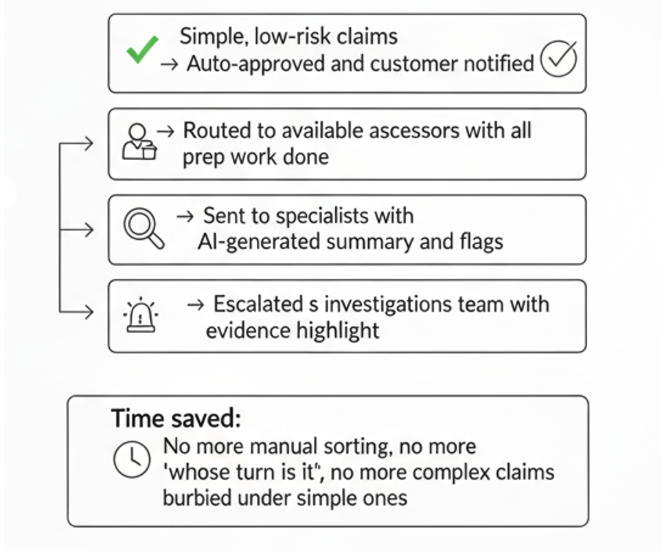 - Complex claims → Sent to specialists with AI-generated summary and flags