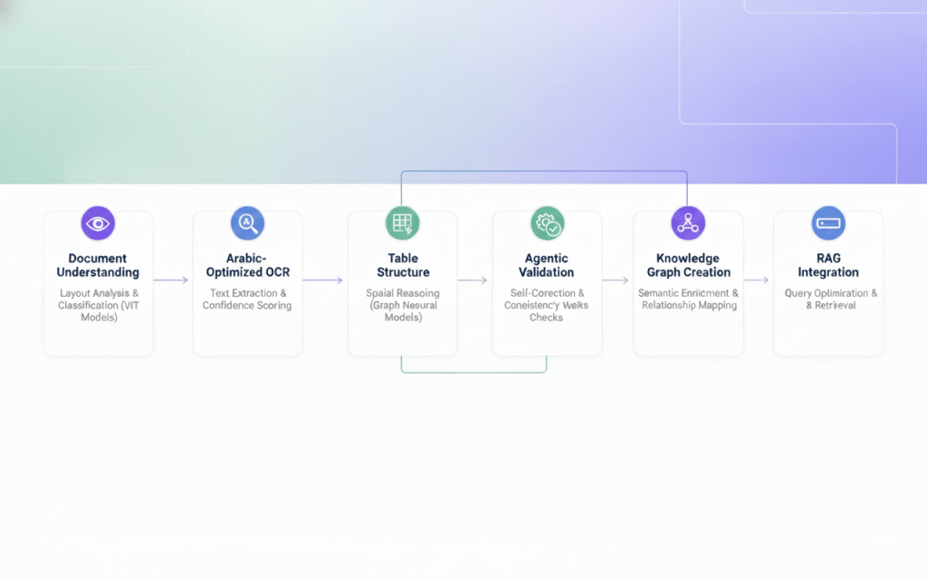 The breakthrough in Arabic insurance document extraction comes from abandoning the idea of a single-pass solution. Instead, modern systems use a sophisticated multi-stage pipeline where each stage specializes in a specific aspect of the problem.