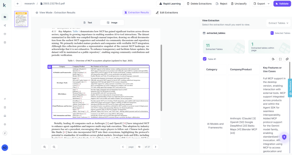Create a project in Kudra and upload your paper corpus like arXiv PDFs, conference proceedings, technical reports. Kudra runs every document through the workflow automatically and shows you the structured output for each one.