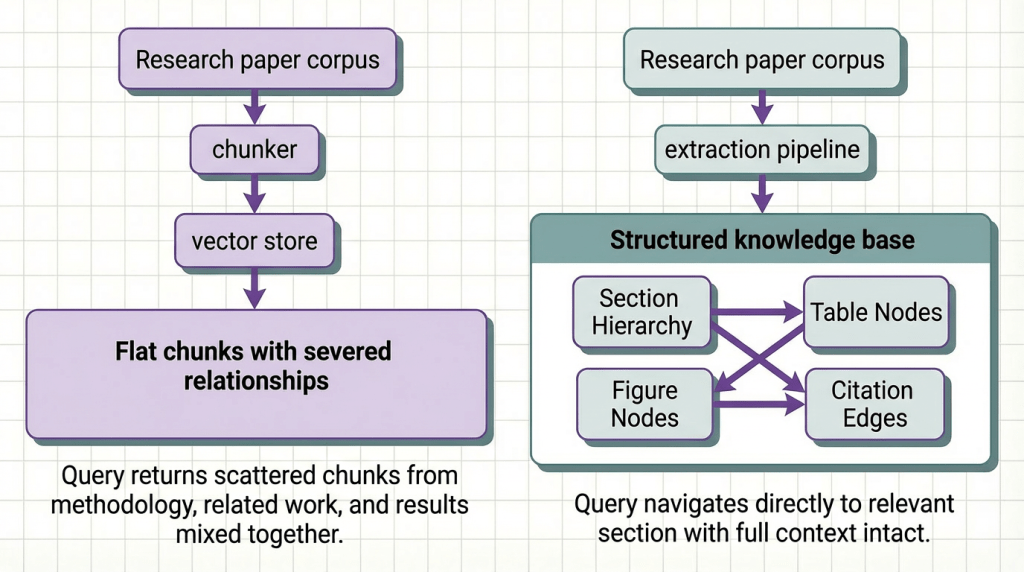They chunk the papers, embed the chunks, stand up a vector store, and call it a knowledge base. Queries come in, similar chunks come back, the LLM generates a response. It works well enough in demos. It breaks quietly in production, returning adjacent context instead of the right answer, hallucinating benchmark numbers that were in a table the pipeline never properly parsed, and failing entirely on questions that require reasoning across the methodology of one paper and the results of another.