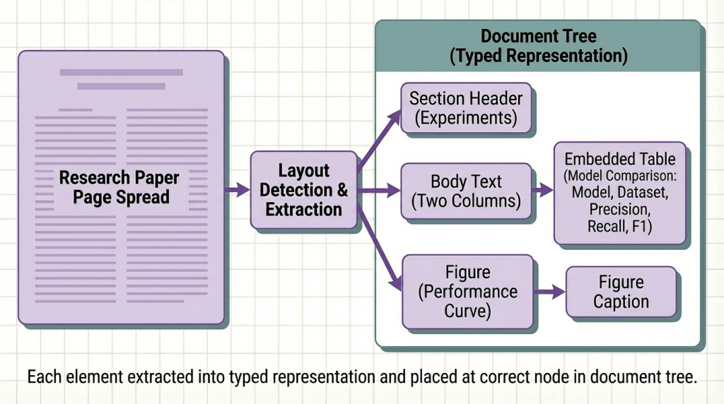 The output of this step is not text. It is a structured document tree where every element has a type, a position in the hierarchy, and a set of attributes describing its content. That tree is the substrate everything else builds on.