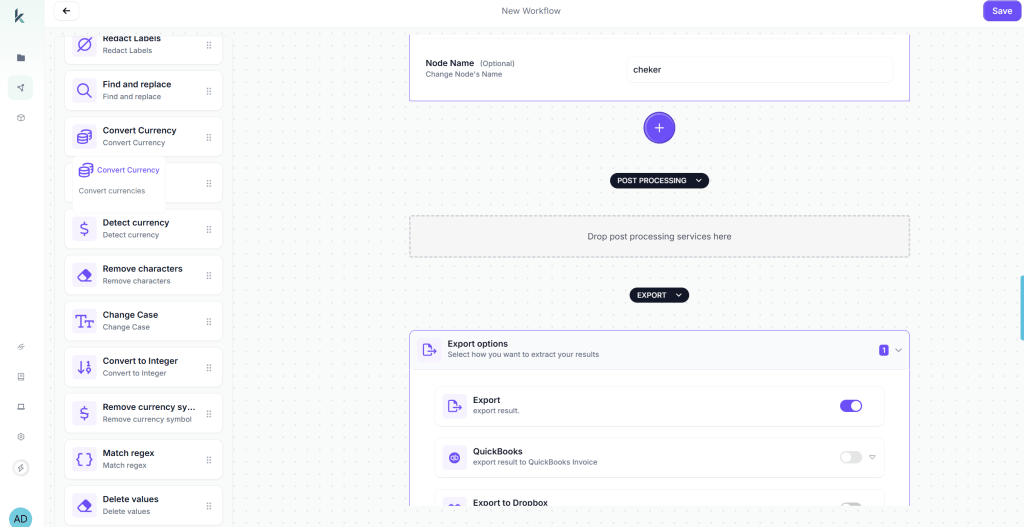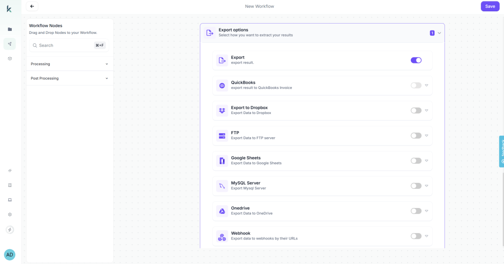 The final step in workflow design is determining what happens to your extracted data. Kudra offers multiple export options that you can enable based on your operational needs: