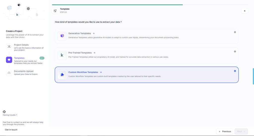 During project creation, you’ll select the workflow you just built from a dropdown menu. This links your passport processing workflow to this specific project, meaning every document uploaded to this project will automatically be processed according to the rules you’ve defined.