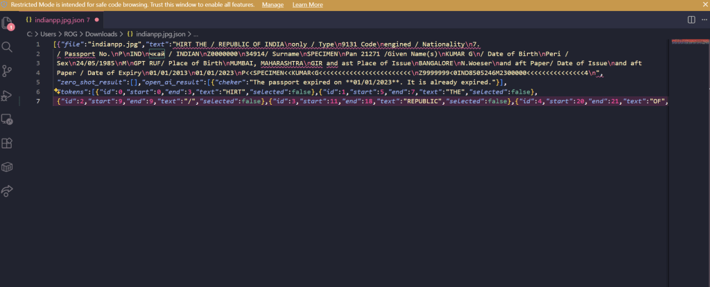 • All extracted fields with their values (name, date of birth, passport number, etc.)