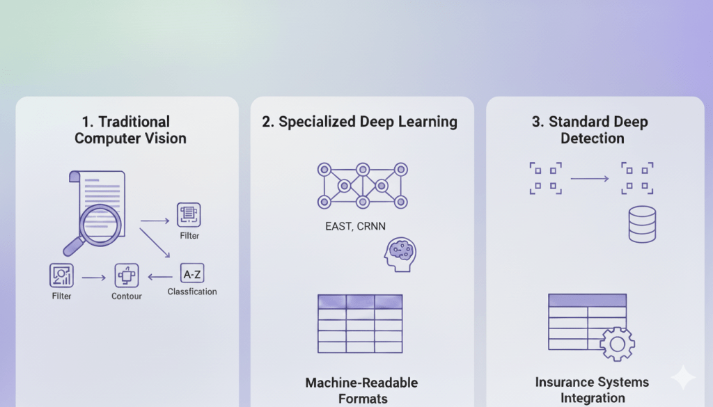 Next, the ML system converts detected text into structured, machine-readable formats that your insurance systems can process. Three main technical approaches exist:
